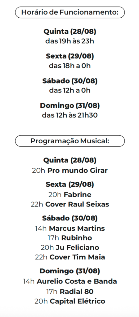 DIA 28 DE AGOSTO (QUINTA) 19h – Abertura da Vila Gastronômica 19h30 – Abertura do Lounge Gourmet
